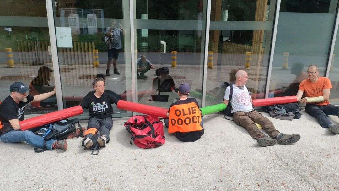 Five supporters of Deurne Dicht In Antwerp used lock-on devices to block the entrance to the private jet terminal at Deurne Airport. All were arrested at the scene.