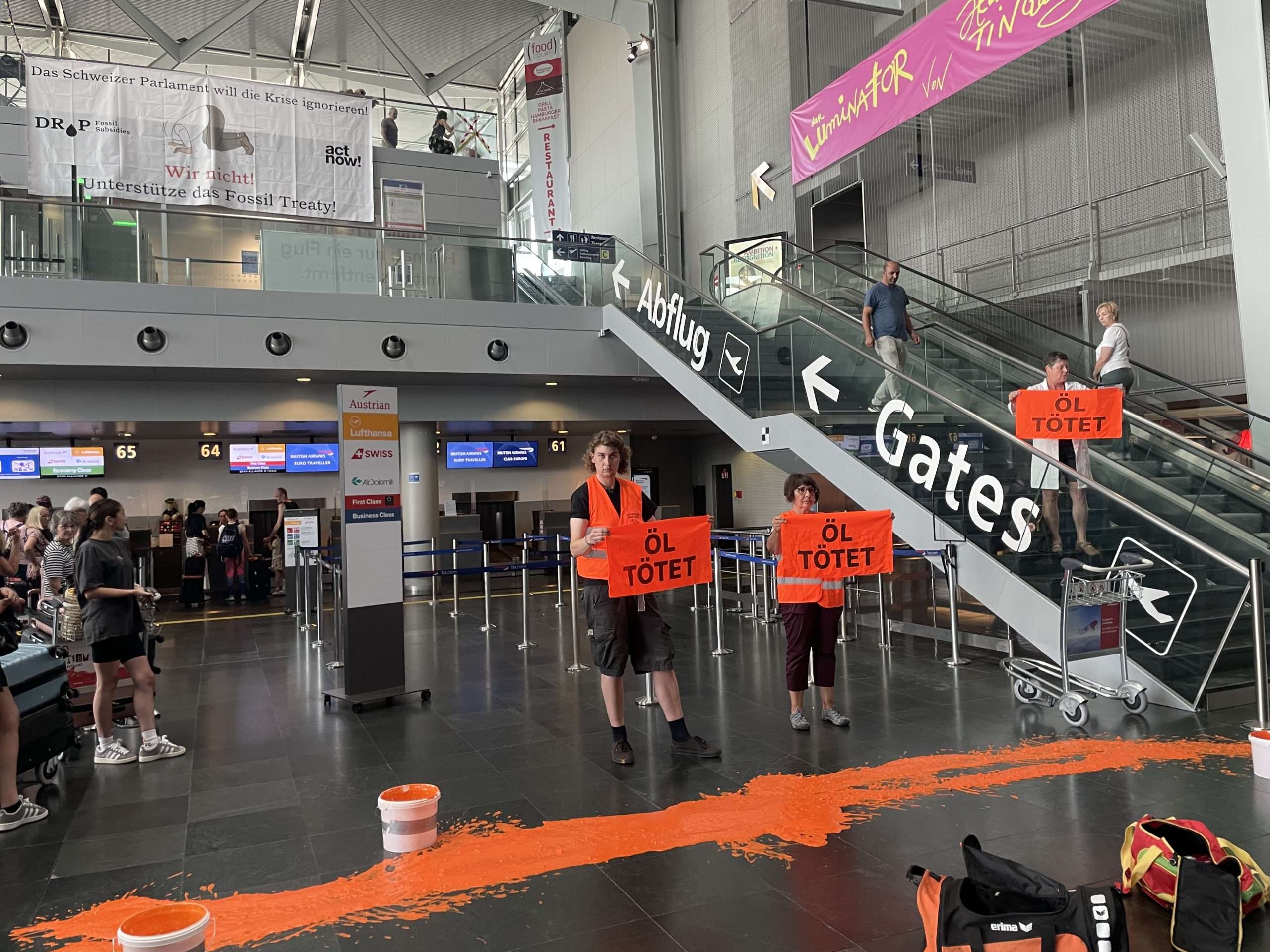 In Switzerland, supporters of the groups DROP Fossil Fuel Subsidies and Act Now! took direct action by painting a thick orange line on the floor in front of the check-in at EuroAirport Basel Mulhouse. They had already taken action