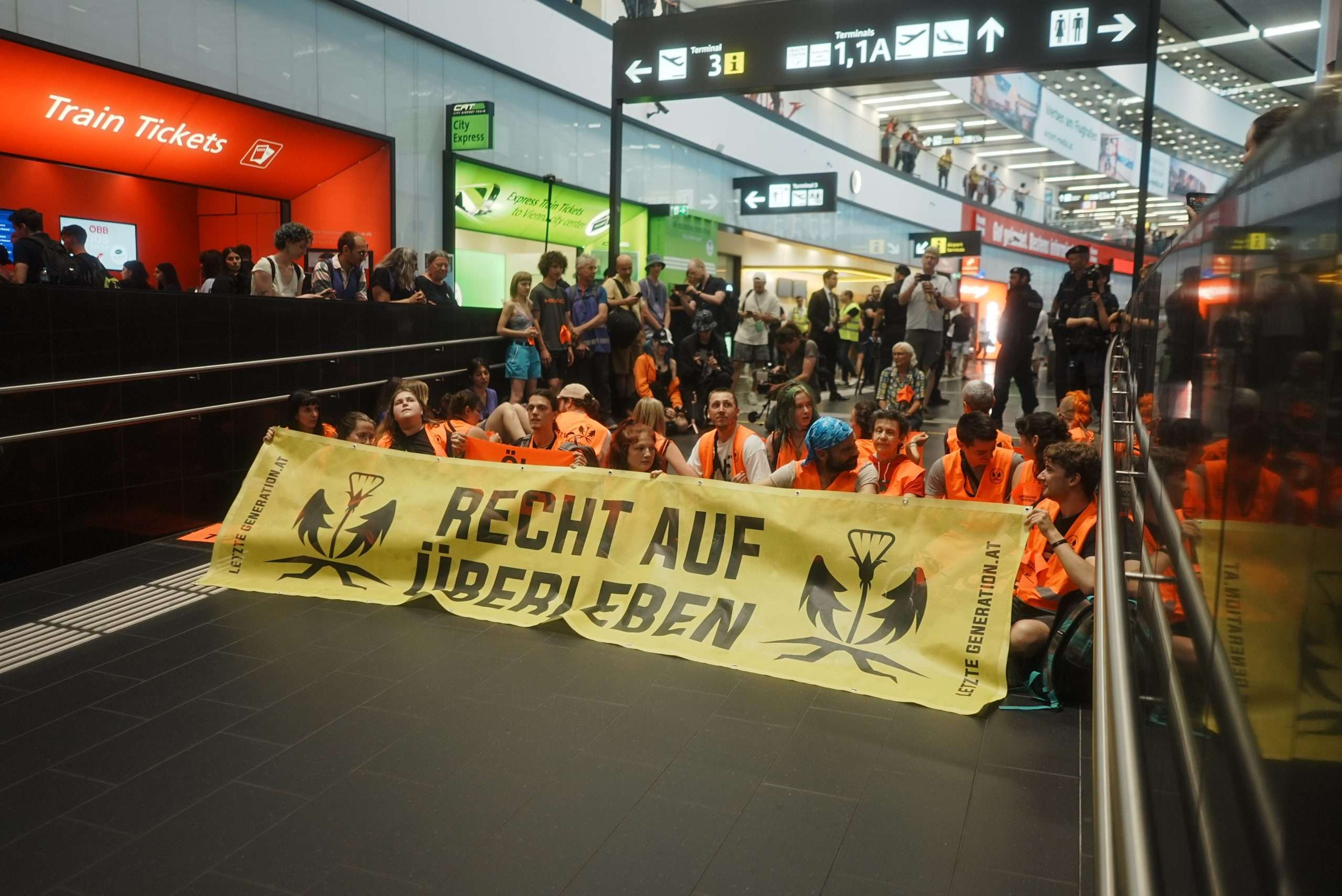 Letzte Generation Austria staged a mass demonstration in the main hall of Vienna Airport. They had already taken action at this airport some days before, including standing up in an airplane, delaying its departure.