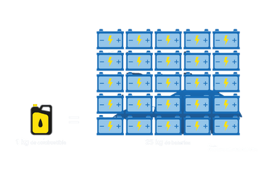Los aviones eléctricos que probablemente se certifiquen en esta década serán muy pequeños y solo podrán realizar vuelos muy cortos. Las baterías son demasiado pesadas para reemplazar a la mayoría de los motores de combustión para aviones. Dada la eficiencia promedio de un motor térmico, 1 kg de combustible equivale a 25-30 kg de baterías (ver gráfico). En muchos casos, los vuelos cortos pueden reemplazarse fácilmente por transporte terrestre mucho más eficiente energéticamente.